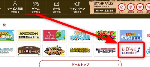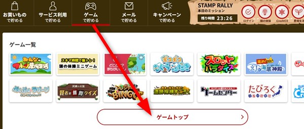 ヘッダーのところの「ゲームで貯める>ゲームトップ」をクリックします。