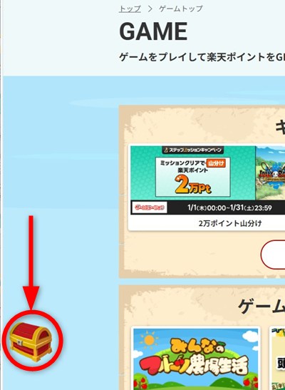 楽天ポイントモールトップページから、ゲームのトップページに行きます。