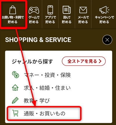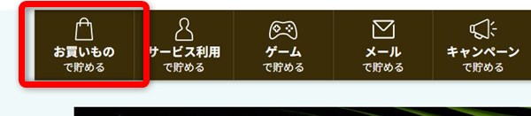 メニューより「お買い物で貯める>通販・お買い物」をクリック。